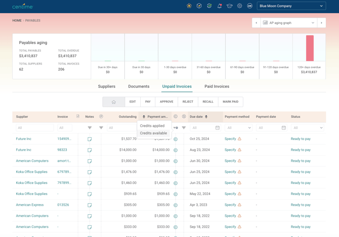 Credits can be applied to invoices on the Unpaid Invoices tab. All the available credits are accessible in the Credits column. Users can also apply a filter to the credits to filter invoices with available credits or applied credits.