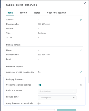 By default, “Use same as global settings” is enabled for all suppliers. This can be disabled to configure a customized discount setting for a specific supplier.
