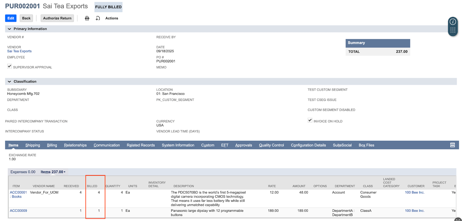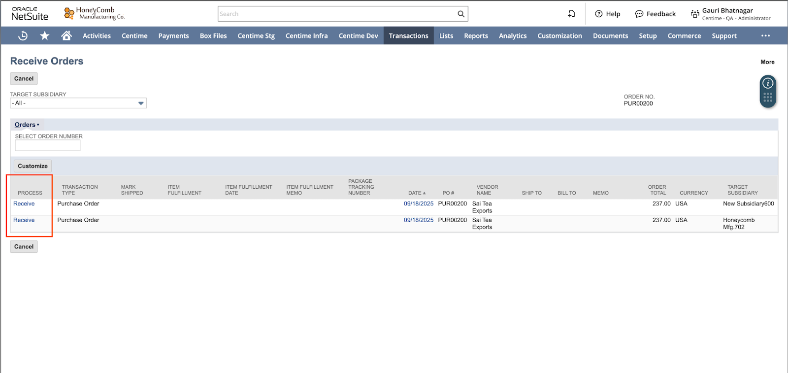 Processing a Centralized PO in Netsuite with billing support from Centime.