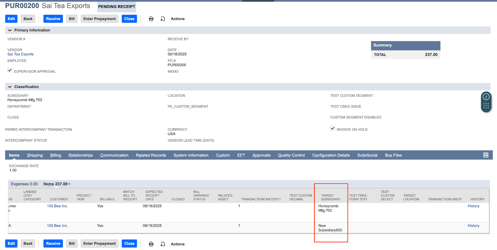 A new field called “Target Subsidiary” will appear in the items table.
