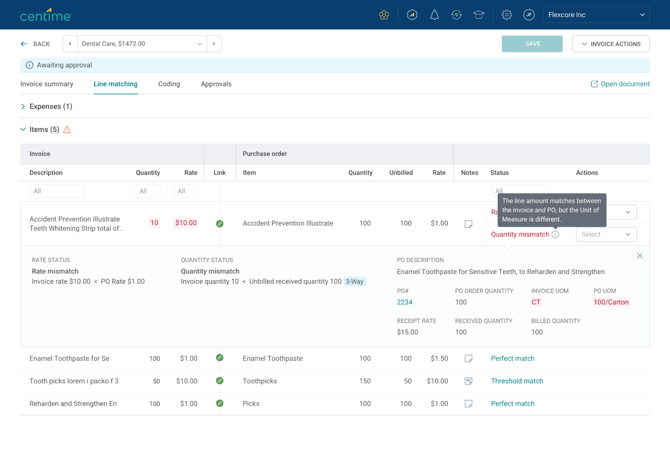 Therefore, Centime will flag the line as a rate and quantity mismatch, with an (i) indicating the mismatch is due to UOM.