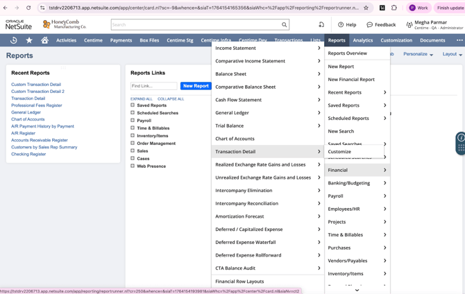- Go to Reports → Financial → Transaction Detail.