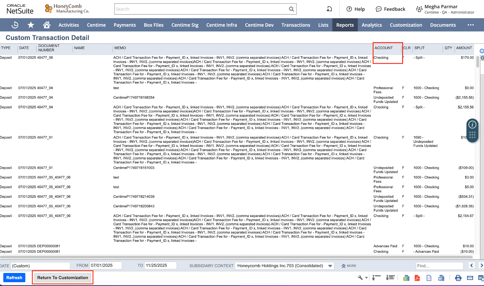 This is the most useful report for reviewing payments, fees, deposits, surcharges, discounts, and journal entries created by Centime.