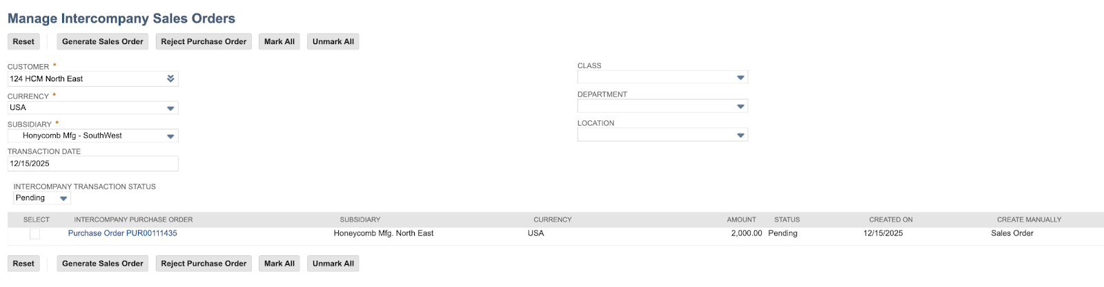 Create a PO for the supplier → (Go to Transactions > Sales > Manage Intercompany Sales Orders) → Enter the details → Select the PO → generate the sales order