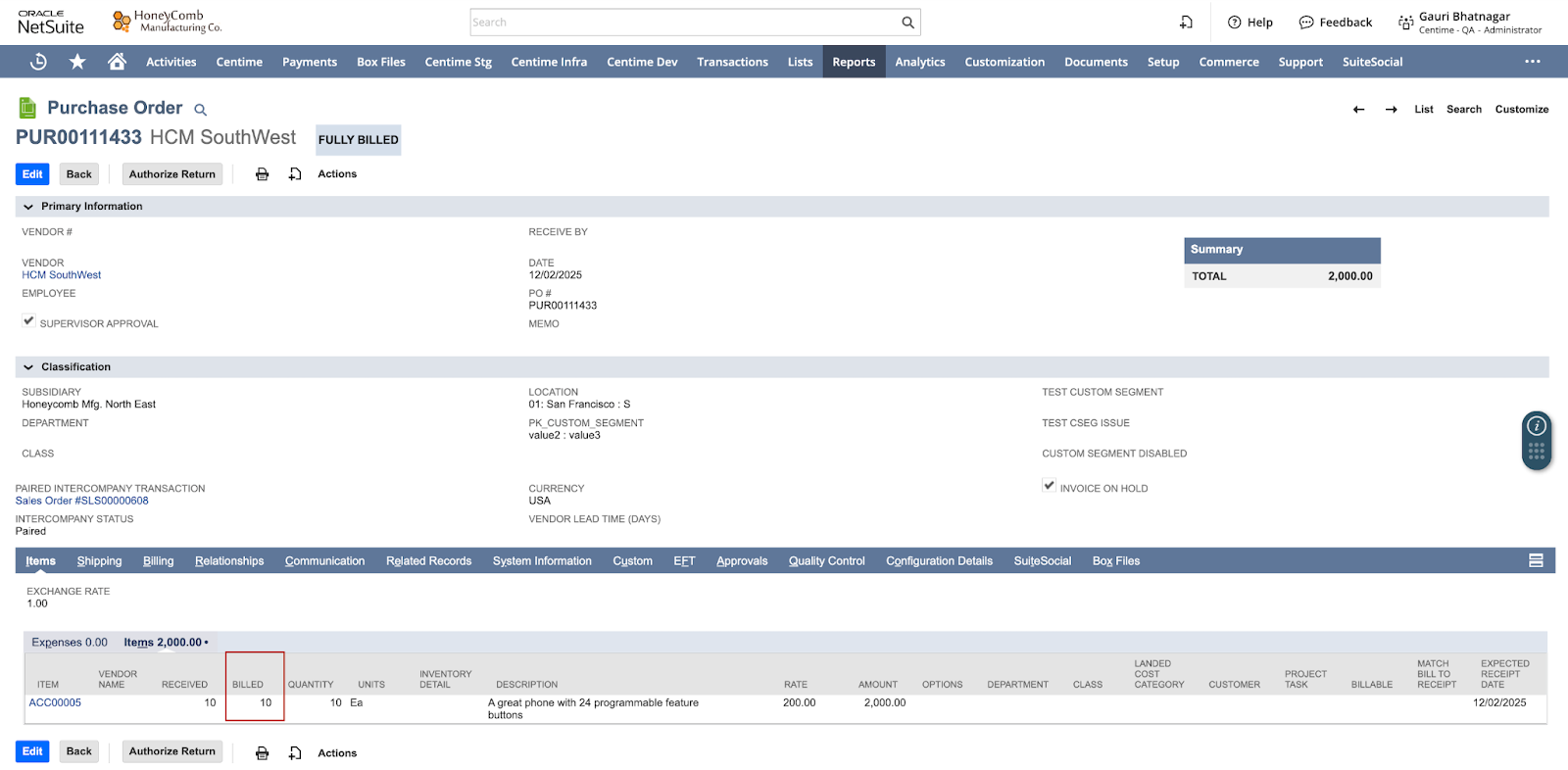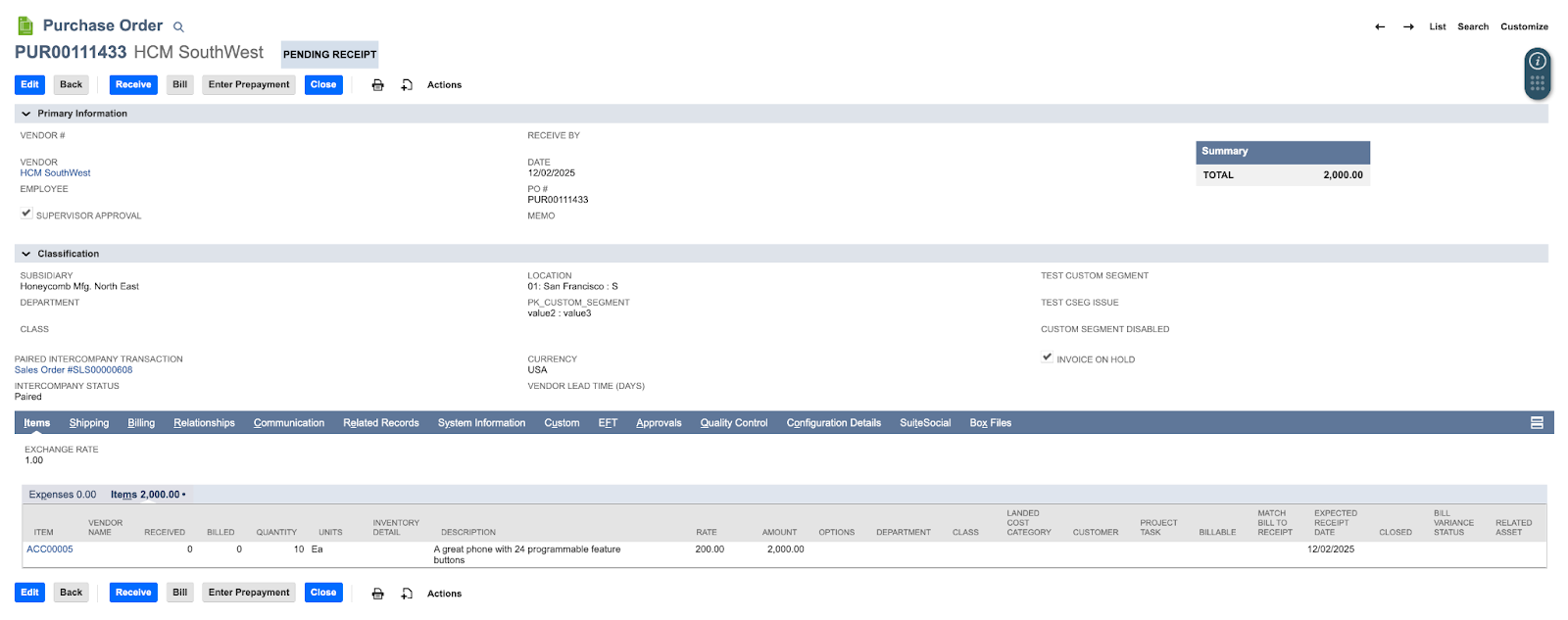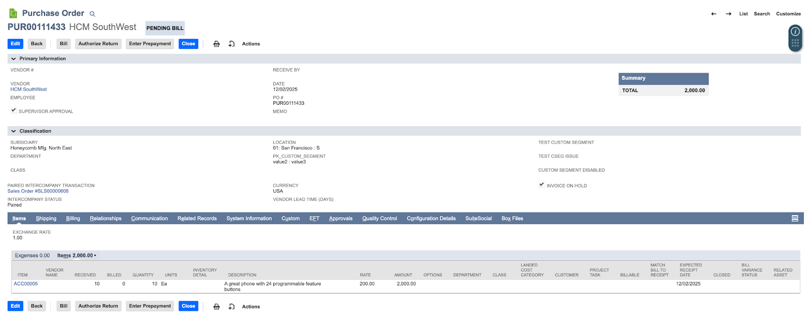 - Paired Intercompany Transaction: Purchase Order #PUR00111433