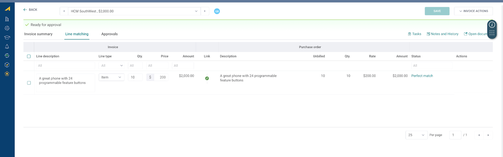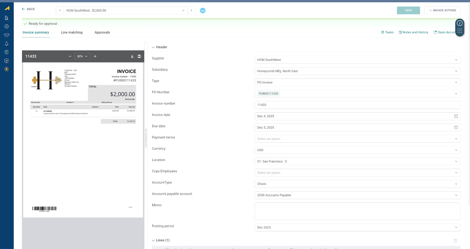 - Invoice line details are reviewed and matched against the PO for accuracy.