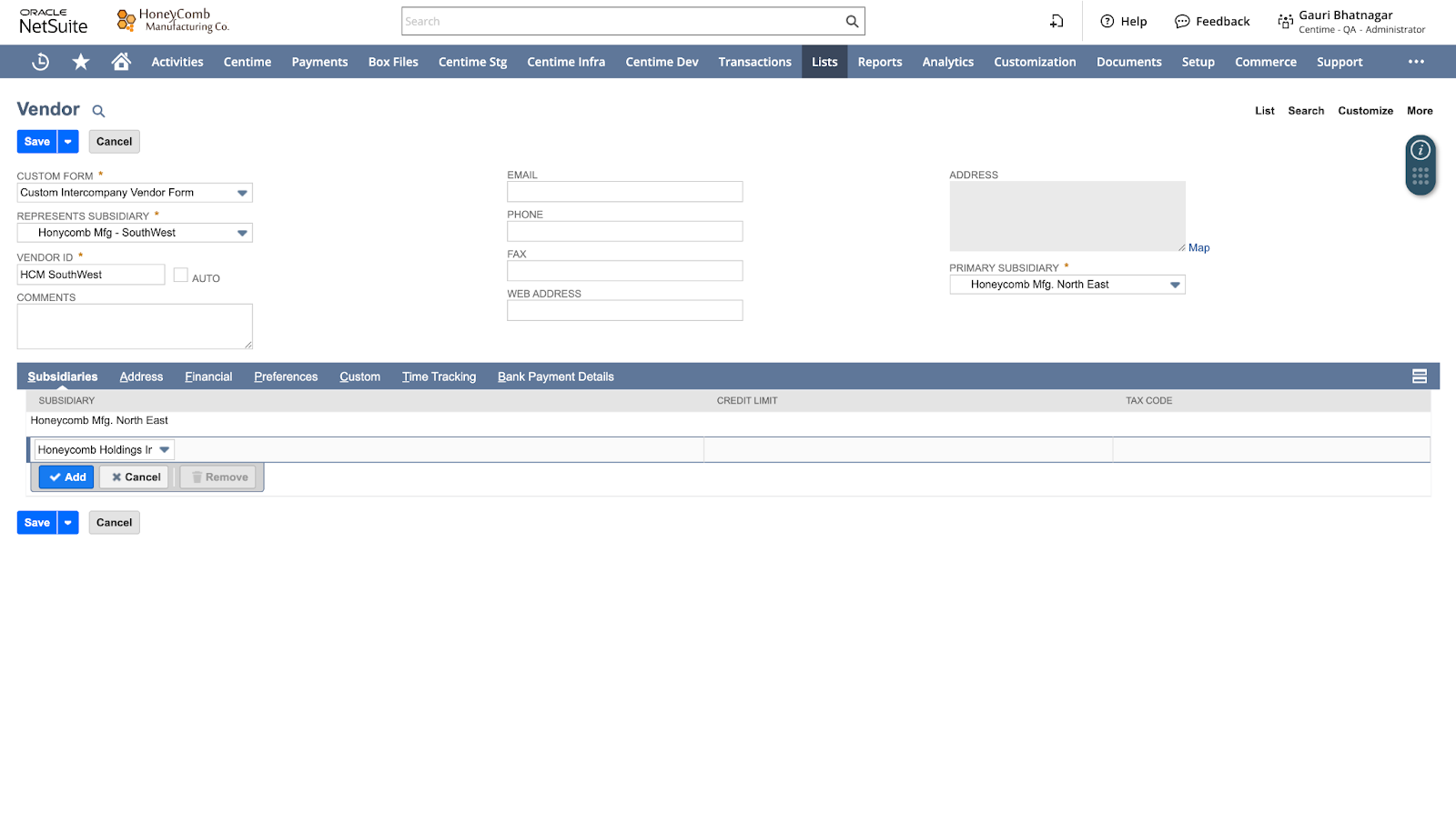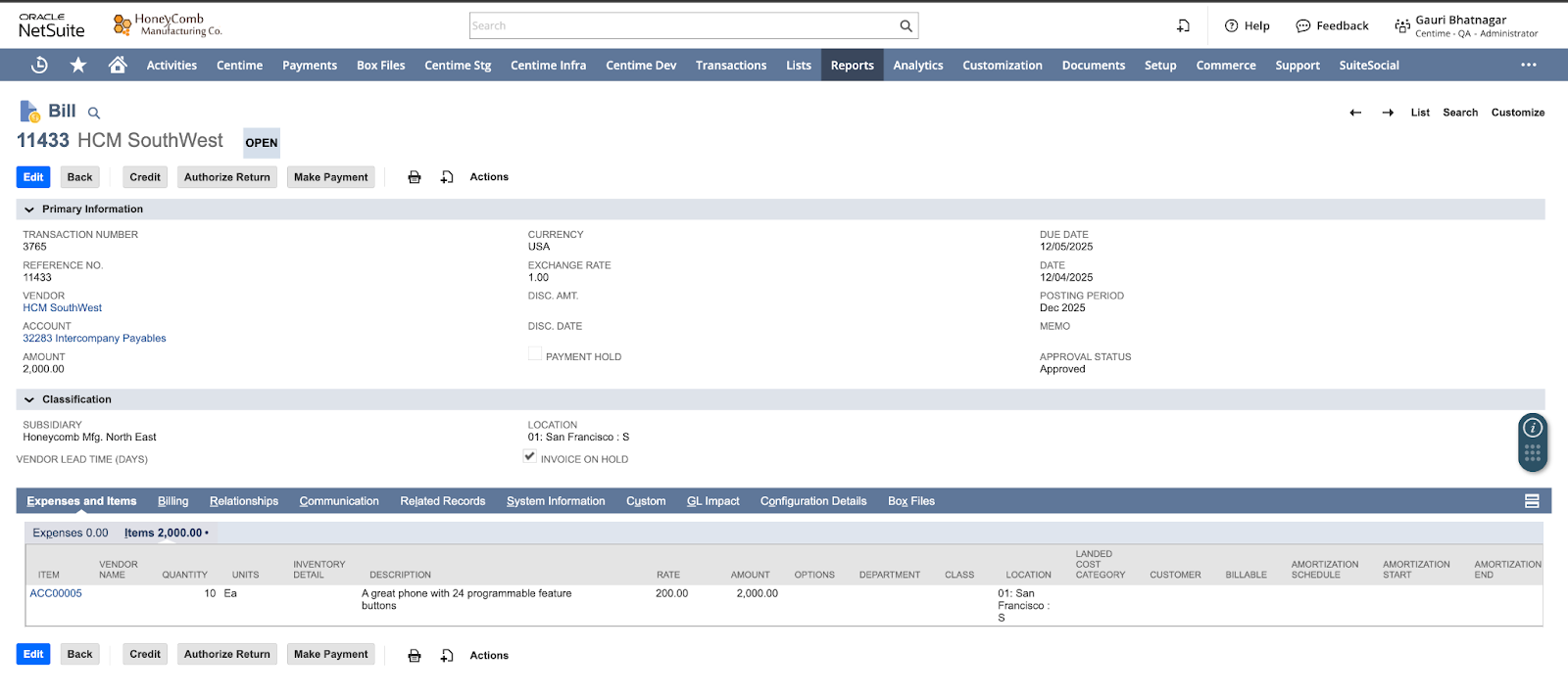 - Vendor invoices are uploaded in Centime, ensuring the correct intercompany vendor and related PO are selected.