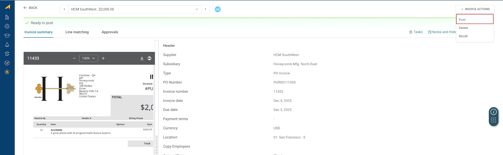- After approval, the invoice is posted from Centime.