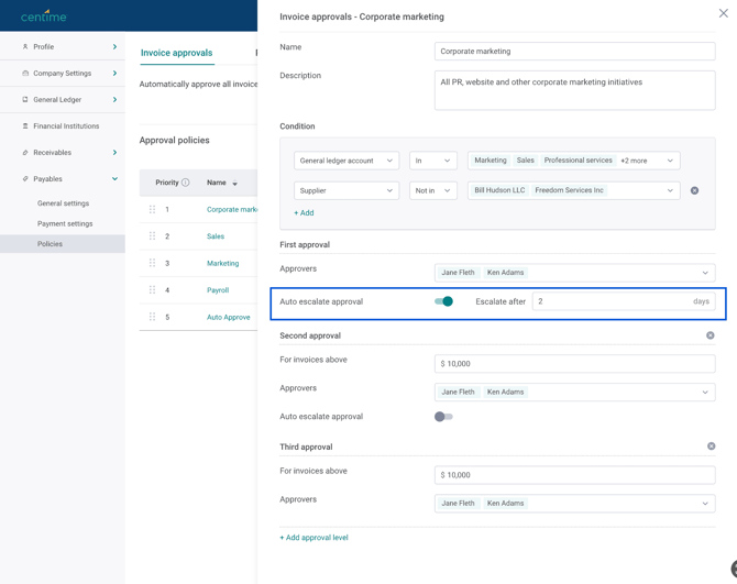 Escalate a policy to the next levelWhile creating a policy, users can set up escalation rules. If escalation is enabled for a level, the invoice will be sent to the next level once the threshold days are reached.