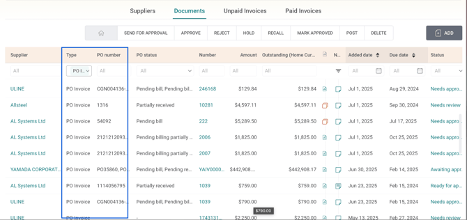 To view this information in the documents table, add the PO Number and PO Status columns. These columns are hidden by default and can be added using the “⋮” icon on the table.