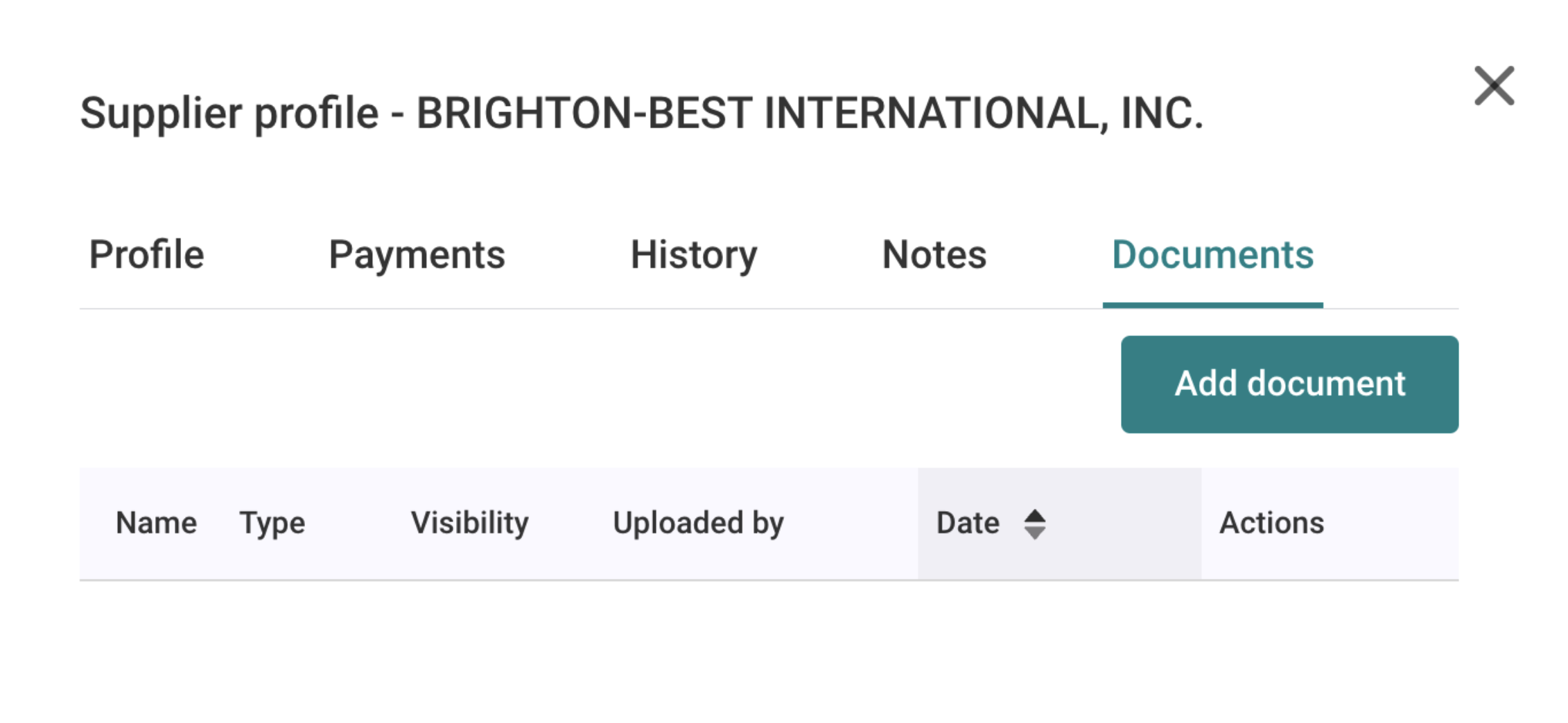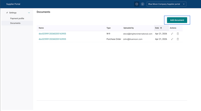 Suppliers can view shared documents in the supplier portal, Settings → Documents. From this tab, they can access documents and upload new ones, which will notify the AP user.