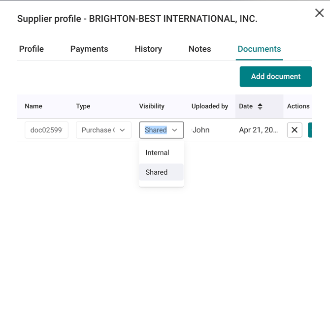 AP users can upload and manage supplier-related documents directly within the supplier profile. Additionally, documents can be shared between AP users and suppliers through Centime.