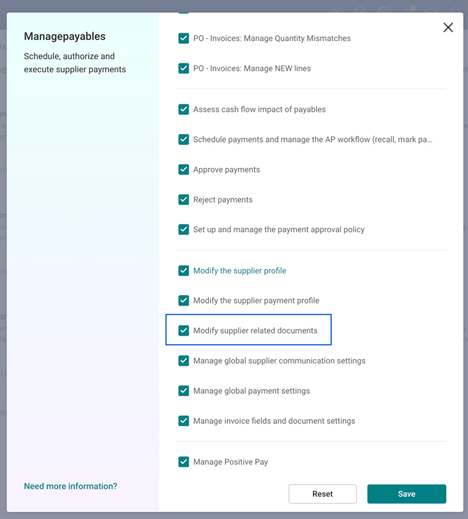 - Access to supplier documents can be managed through permissions. Manage Payables section→ Modify Supplier Related Documents to allow users to view, upload, and manage supplier documents.