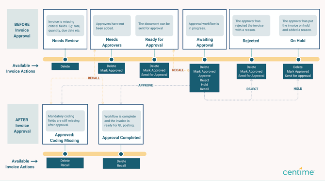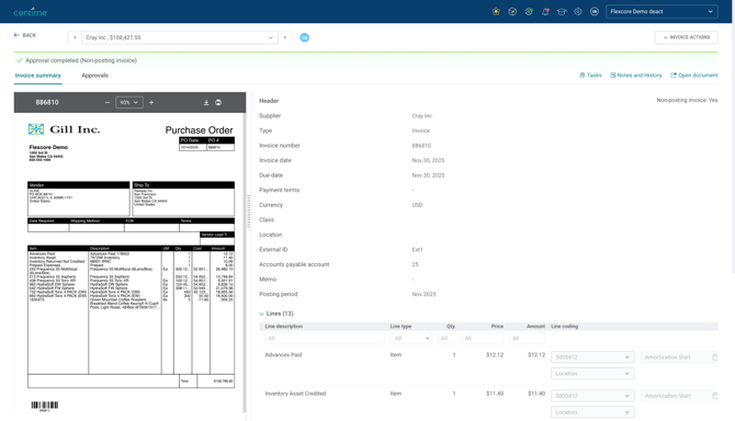 - Once the invoice receives final approval, its status will update to “Approval Completed” (instead of “Ready to Post”), indicating that it will remain in Centime and not be posted to the ERP.